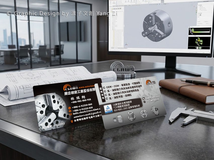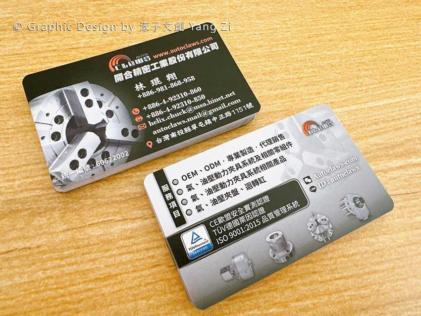 黑灰色系搭配機械零件視覺元素,呈現精密工業專業形象的企業名片設計。